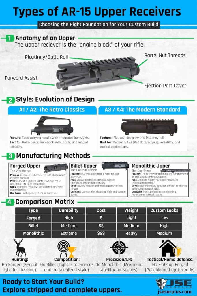 A range rifle usually doesn’t require advanced features, while duty or defensive rifles benefit from proven designs. If you plan competition or precision shooting, billet and monolithic uppers may be the best choice.