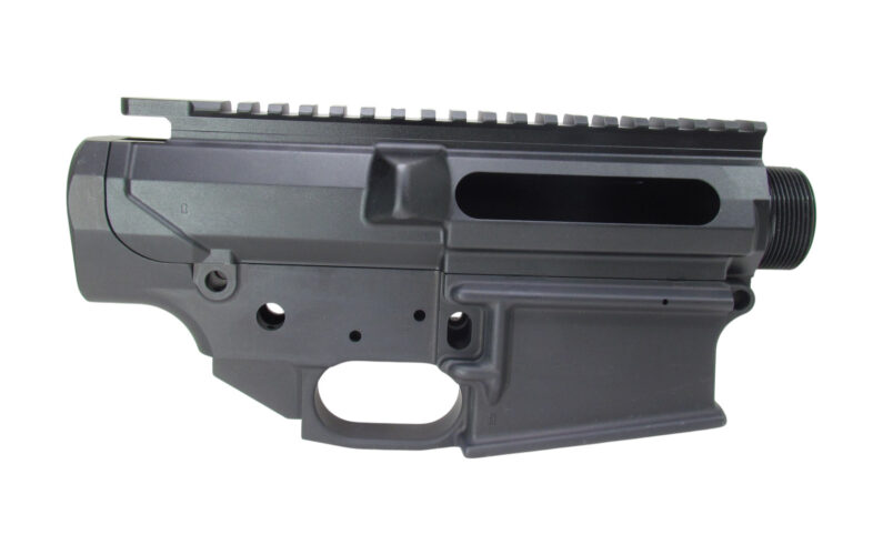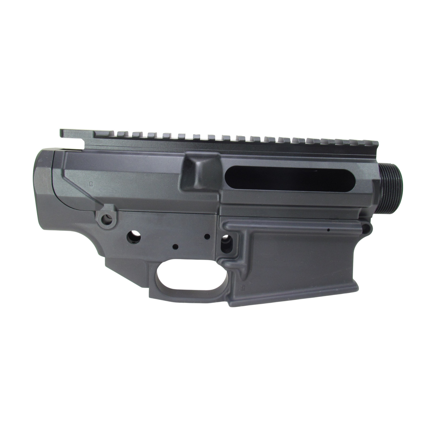Compatible with AR-15 platform pistol grips, features options for a threaded bolt catch pin and (threaded) rear takedown detent placement.