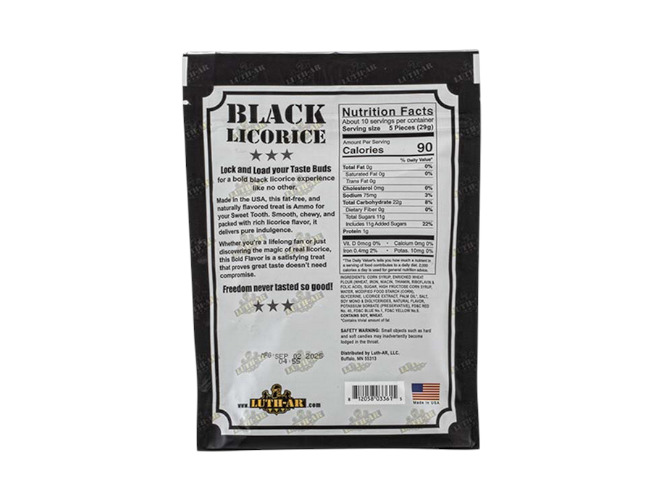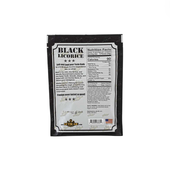 Lock and Load Your Taste Buds with a bold black licorice experience like no other. Made in the USA, this fat-free, naturally flavored treat is the ultimate “ammo” for your sweet tooth. Smooth, chewy, and packed with rich licorice flavor, Black Licorice by Luth-AR delivers pure indulgence whether you enjoy it in the gunroom or at the range.