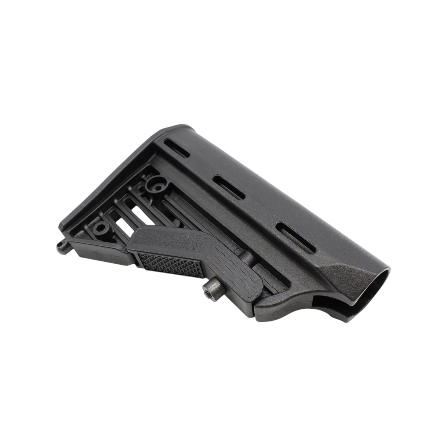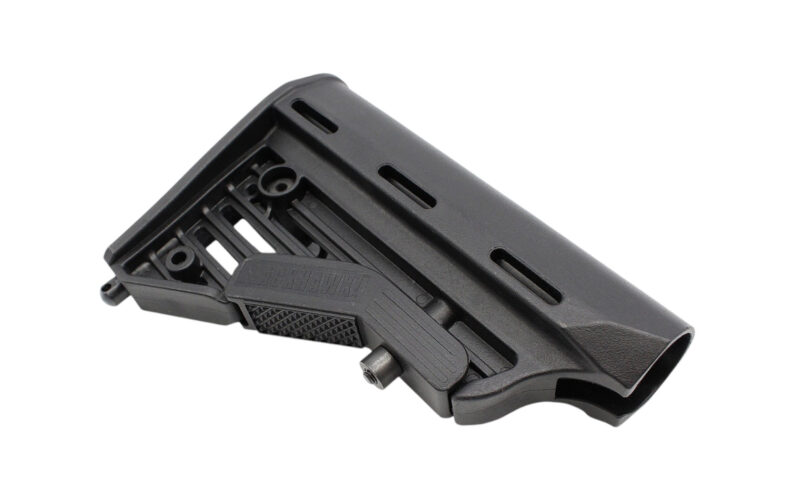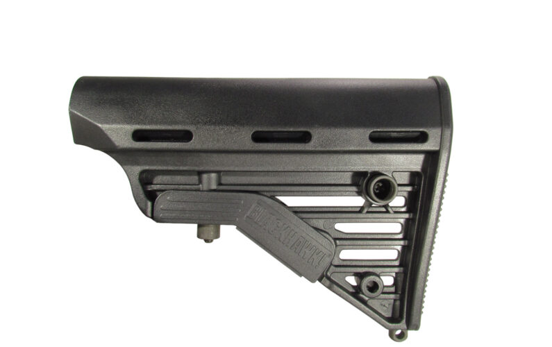 This BLACKHAWK! Knoxx M4-Style Collapsible Stock is constructed of high impact, glass-reinforced polymer, and is an excellent way to increase the versatility of an AR-15 carbine due to its ability to instantly adjust the length of pull to fit different users or circumstances. While the stock’s design closely follows the lines and general appearance of the US military’s M4 Carbine buttstock, several subtle improvements have been integrated to enhance its overall functionality. These include a more substantial comb for a comfortable cheek weld and reduced neck fatigue, a pair of side-mounted, quick detach sling swivel sockets, a recessed stock adjustment latch, and a bottom-mounted, fixed sling swivel stud located at the toe. This stock is compatible with AR-15 and SR-25 / LR-308 type carbines that are equipped with a multi-position receiver extension buffer tube (sold separately).