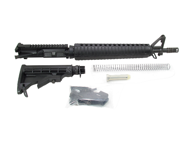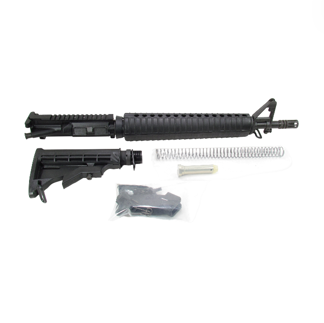 The kit includes a complete Lower Receiver Parts kit that is ready for installation into the host stripped lower. A M4-Style Collapsible Buttstock Assembly rounds out the package with a Mil-Spec diameter buffer tube, carbine buffer and buffer spring. Stripped lower receiver and magazines are NOT included. Upper receiver is fully assembled at the factory, lower parts kit and stock assembly will need to be installed by the end-user.