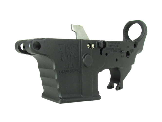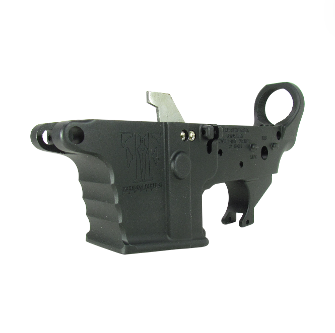 The Freedom Factory Tactical AR-9 Stripped Lower Receiver is a forged aluminum stripped lower receiver for the AR-9 platform with Glock-pattern magazine compatibility. It features an anodized black finish and is a stripped configuration with no internal components included.