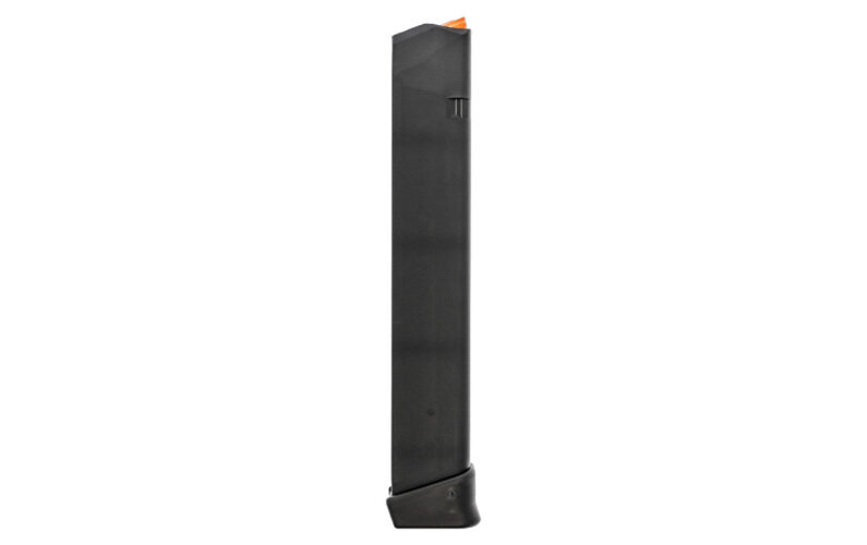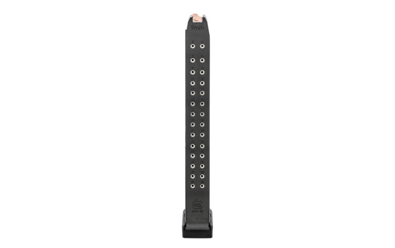 These 33-round extended magazines are the ultimate in high-capacity factory Glock gear. Built from the same durable polymer as other factory Glock magazines, with the same full-length steel inserts and numbered witness holes, these 33-round mags are the ultimate addition to any 9mm Glock kit.