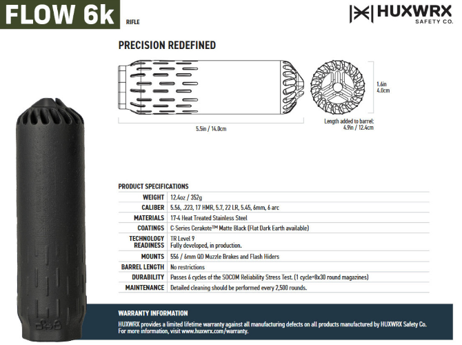 The HUXWRX Flow 6K builds upon the success of the Flow 556k, featuring an innovative design made possible through DLMS, 3D-Printing, manufacturing. This 3D-printed Stainless Steel construction allows you to use the HUXWRX Flow 6K on 5.56mm, .223, .17HMR, 5.7, .22LR, 5.45, 6mm, and 6ARC cartridges with NO barrel length restrictions. The Flow-Through Technology ™ means you can tame even your most finicky hosts, without the need for tuning.