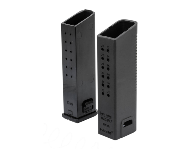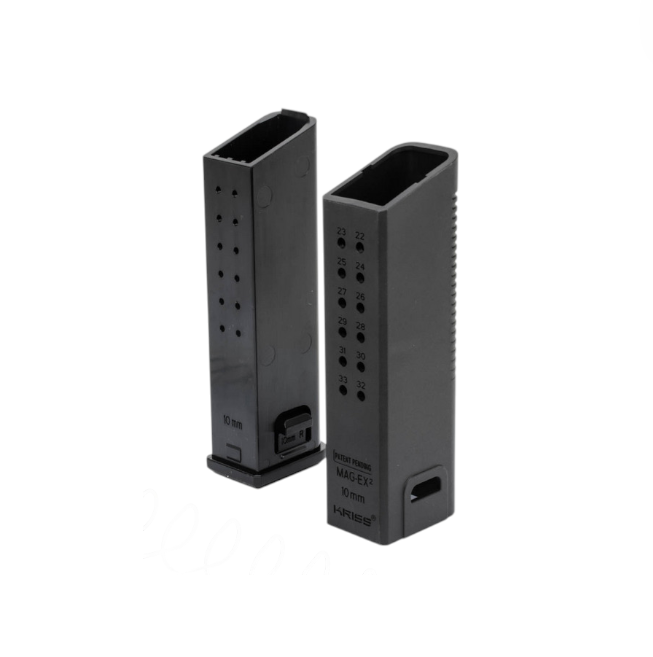 The MagEx2 Kit is caliber-specific and available in 9mm, 10mm, and .45ACP and designed for standard capacity G17, G20, and G21 magazines for an overall capacity of 40 rounds of 9mm, 33 rounds of 10mm, and 30 rounds of .45ACP for your KRISS Vector, Glock handgun, and your Glock magazine-compatible pistol caliber carbine.