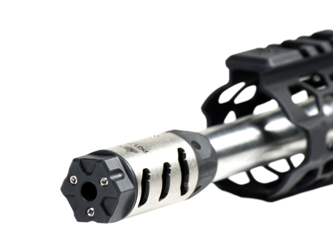 The ODIN Works ATLAS family is true innovation when it comes to muzzle devices. The ATLAS  features a 3-piece modular design that makes installation simple and fast. The core and the cap are machined from 416R stainless steel and black nitrided while the sleeve is made from titanium. Timing and tuning is done with the titanium sleeve, no shims or crush washers needed.