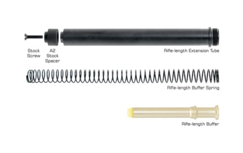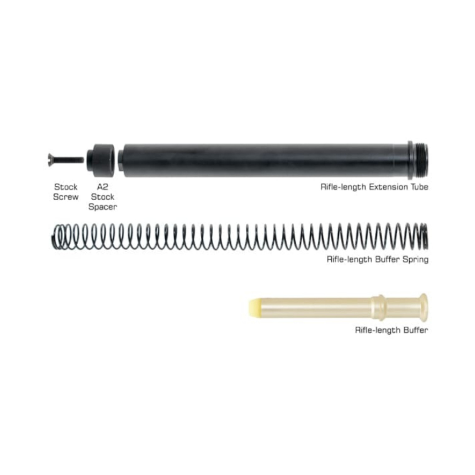 - Includes Rifle-length Extension Tube, Buffer 6061-T6, and Spring, A2 Stock Spacer, and Stock Screw