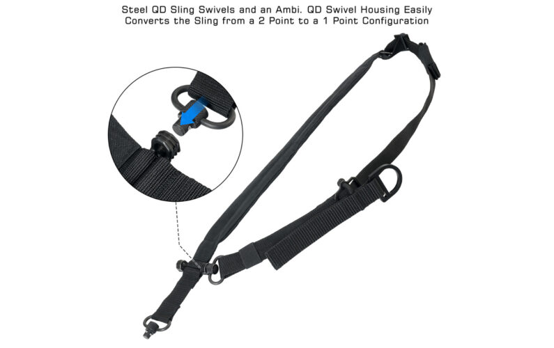 - Steel QD Sling Swivels and an Ambi. QD Swivel Housing Easily Converts the Sling from a 2 Point to a 1 Point Configuration